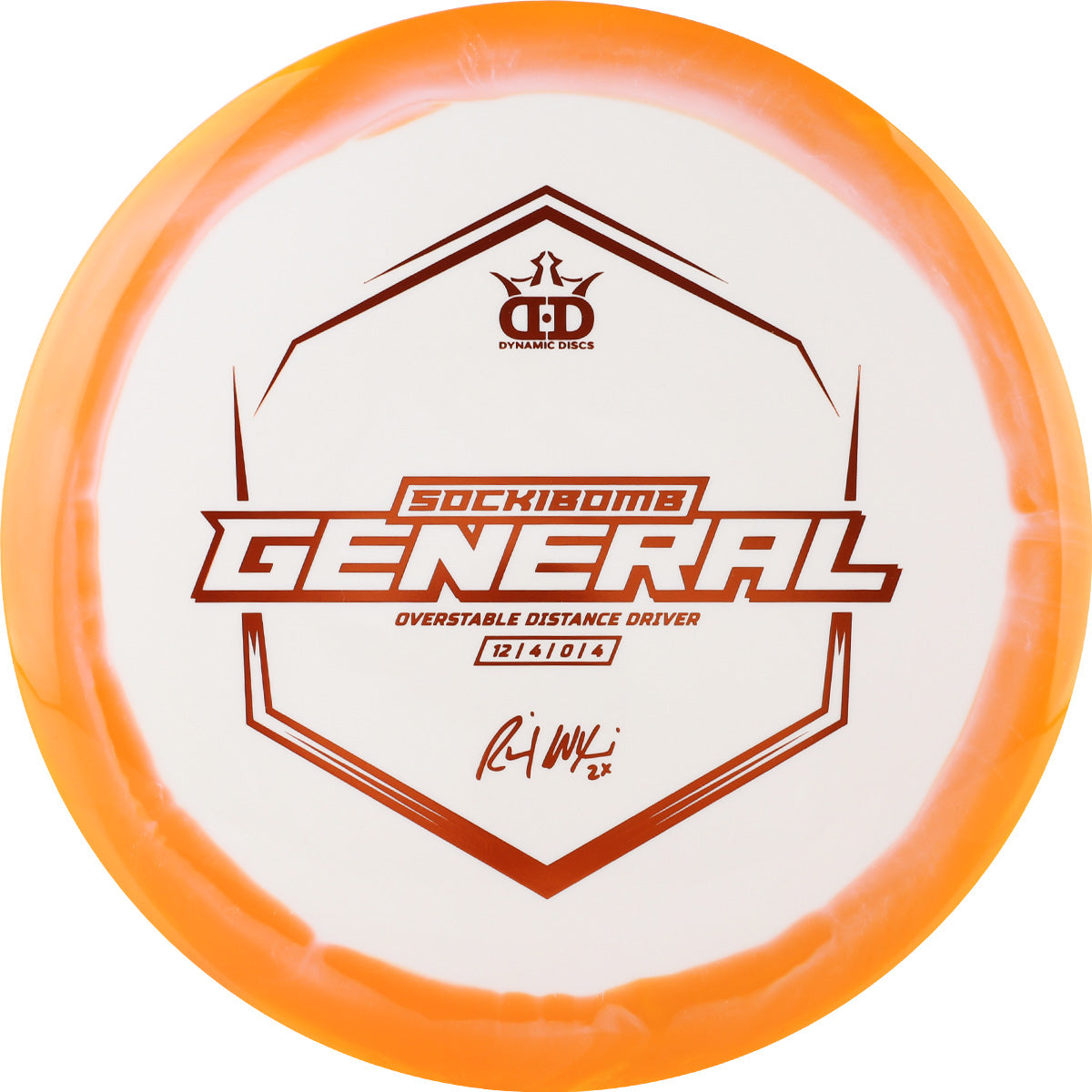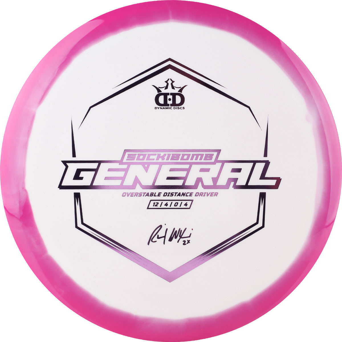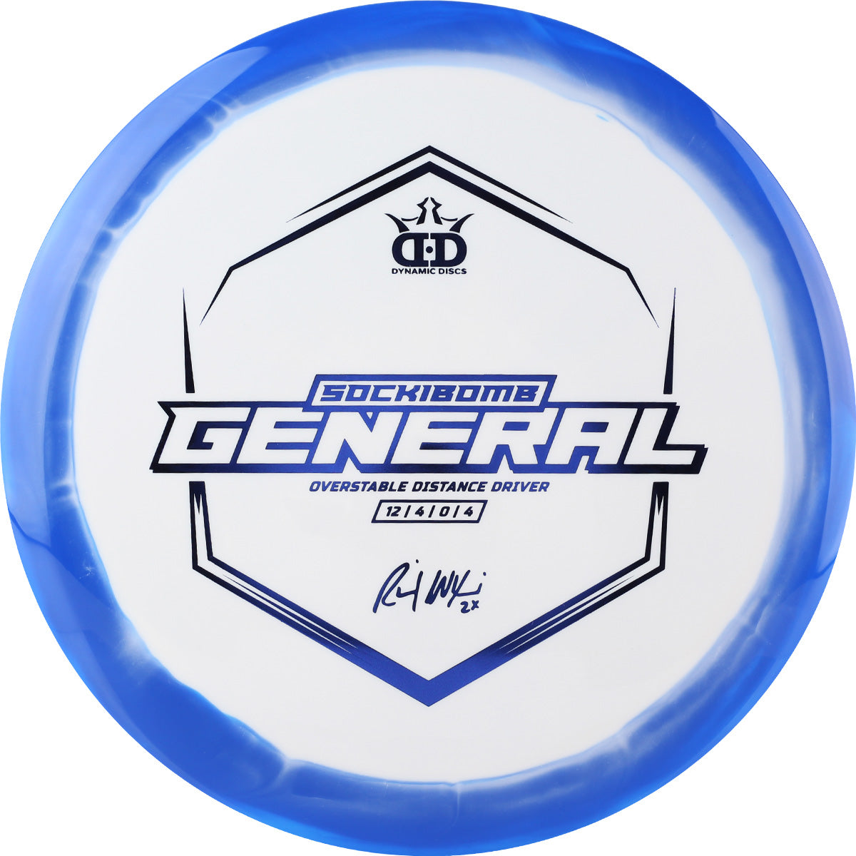 The Sockibomb General from Dynamic Discs is a new overstable distance driver and the latest addition to the Supreme Series lineup. Designed in collaboration with 2x World Champion Ricky Wysocki, this commanding distance driver is tailored for maximum distance flights for those players with higher arm speeds. Those with slower arm speeds will find the General a reliable, repeatable, wind-fighting utility disc.