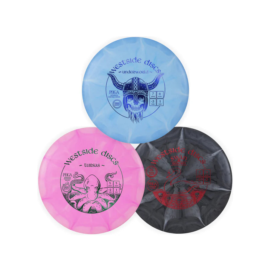 Whether you're just starting out or looking to expand your disc collection, the Westside Discs Burst 3-Disc Starter Set offers the perfect combination of discs to enhance your game. With this set, you'll be ready to tackle any course with confidence and style.